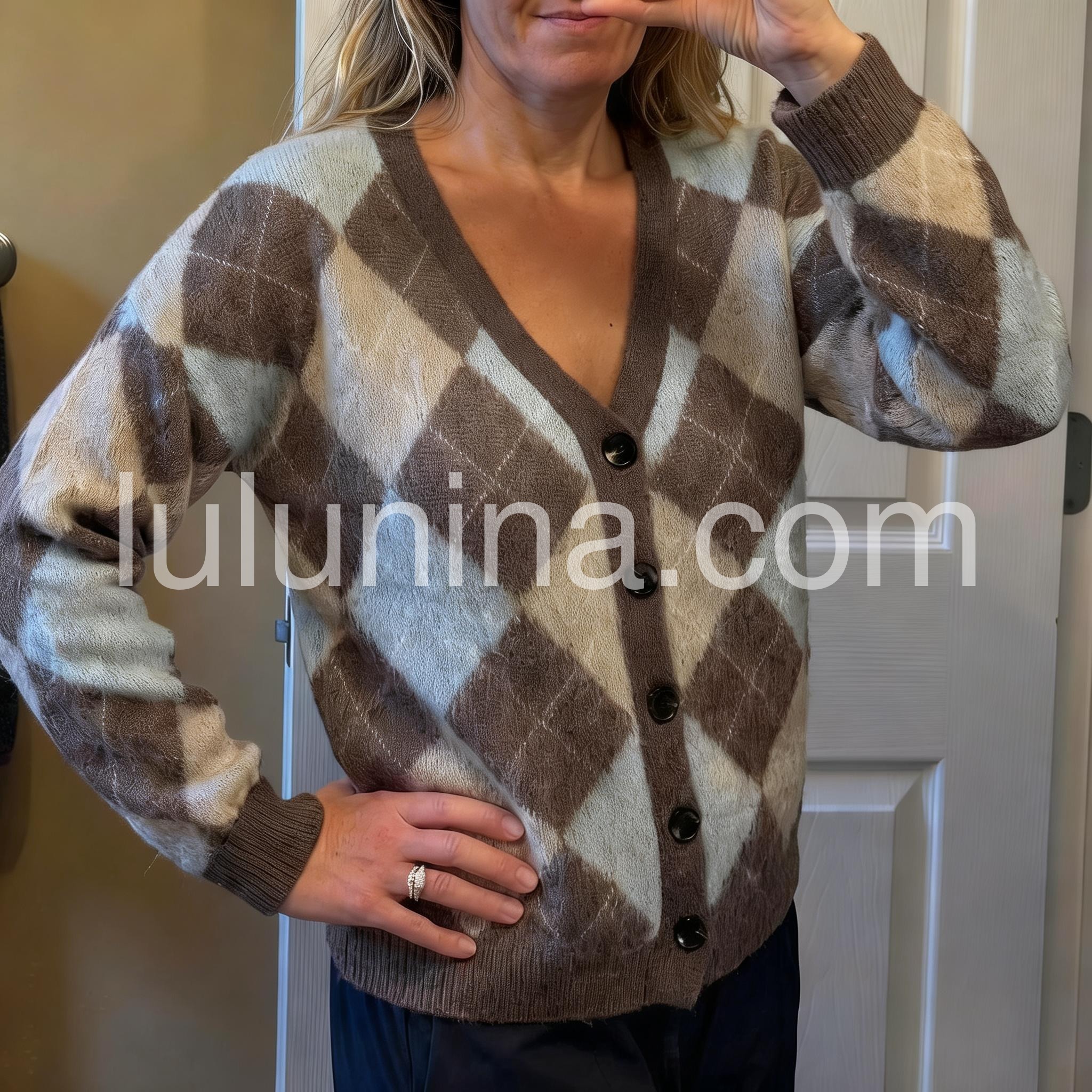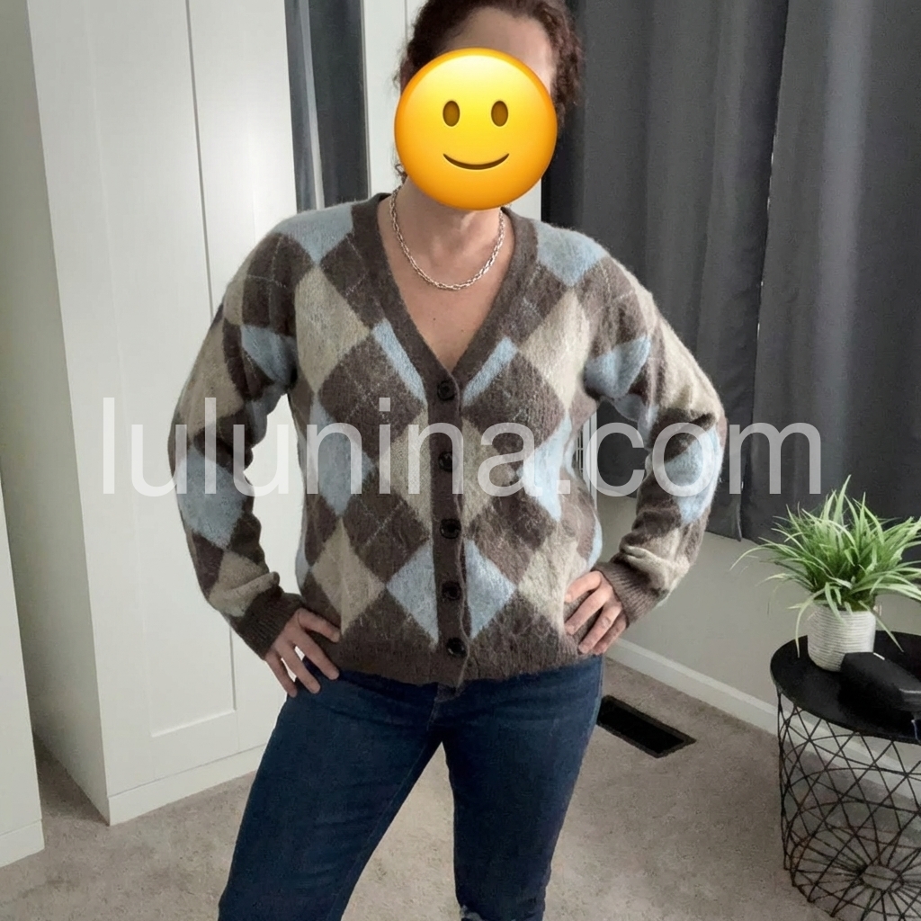 This cardigan features a timeless argyle geometric print in versatile neutral tones, offering a sophisticated layering option. Crafted with a button-front design, it allows easy wear and adjustable styling. Its refined pattern blends classic and contemporary elements, making it an ideal choice for enhancing both casual and polished outfits with subtle texture and depth.