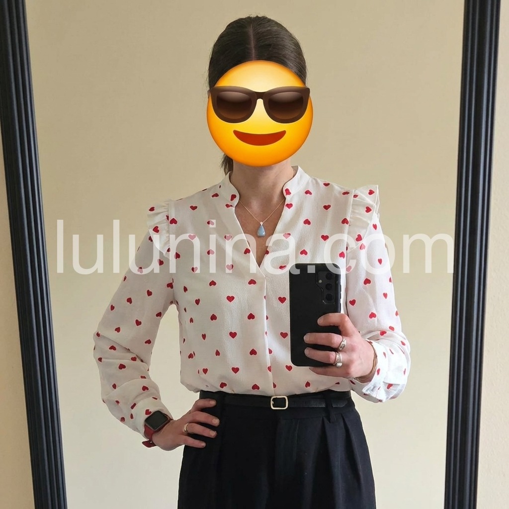 Take this lightweight red heart blouse anywhere with its fitted leg o’ mutton long sleeves with flared ruffles on the shoulders. The plunging fold-over v-neckline and fitted silhouette can be paired with high-waisted denim, slacks, or shorts. Finish your look with casual sneakers, sandals, and so much more. Wash in gentle or delicate cycle with light colors. Keep away from dark colors. The delicate fabric may absorb dark colors.