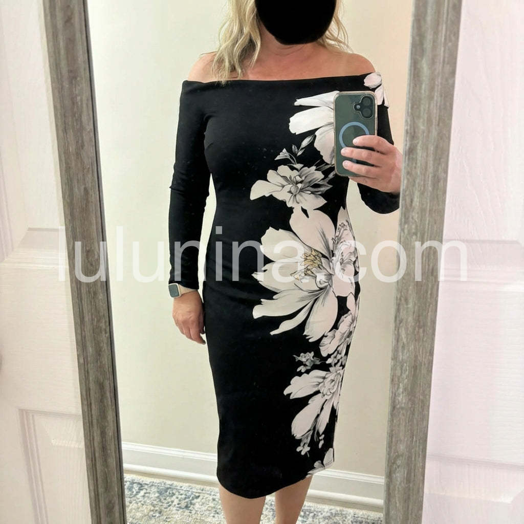 Crafted with style and sophistication in mind, this black midi dress features long sleeves, creating a versatile look for any occasion. Made with quality materials, this dress offers comfort and effortless elegance. Perfect for any fashion-forward individual looking to elevate their wardrobe.