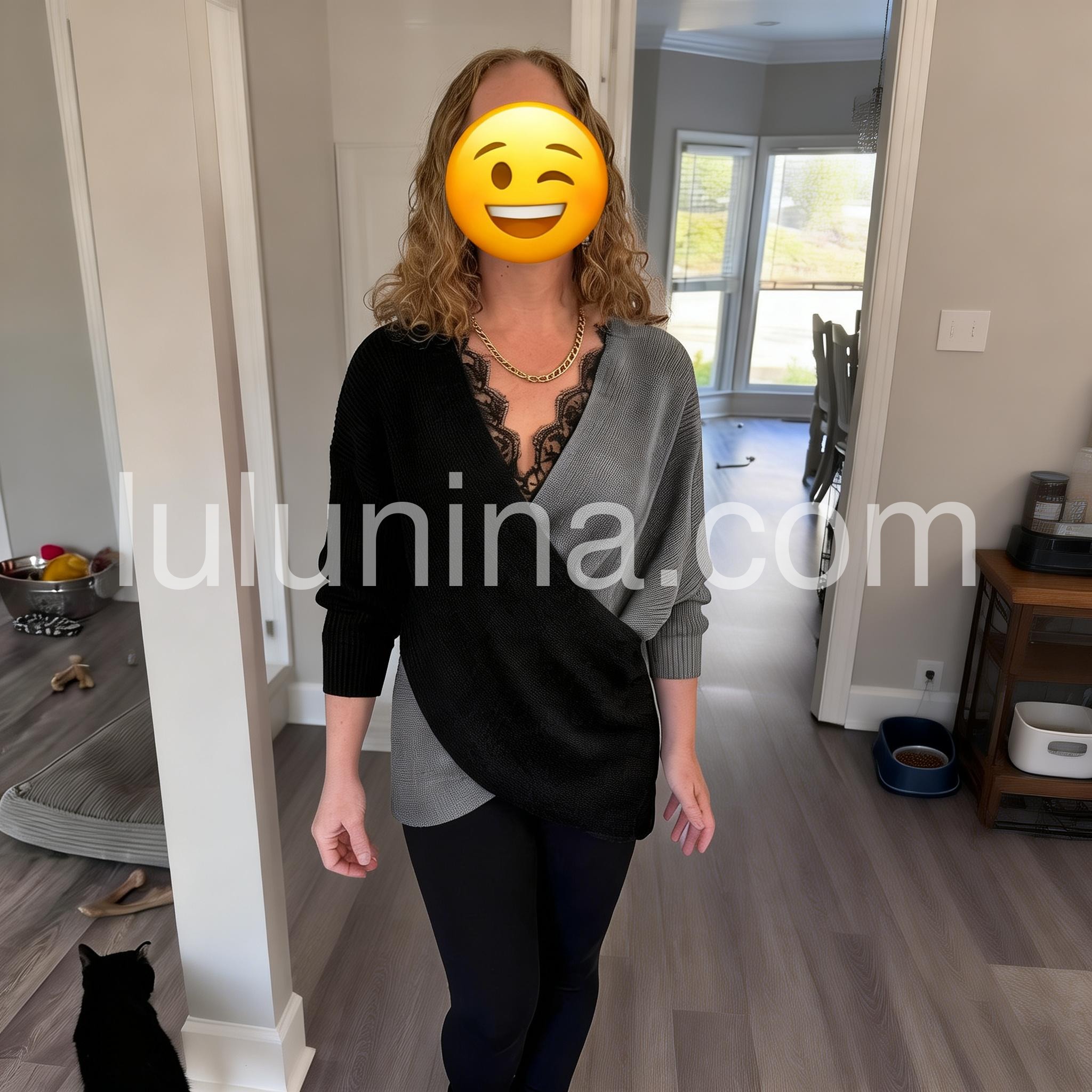 Indulge in this ultra-luxurious sweater, perfect for slightly cooler nights and days! This cozy knitted sweater features a black and gray side that gives way to a plunging v-neckline, along with billowy fitted sleeves for a chic look that is trendy and elegant. Wear this below the waist sweater with your favorite layering necklaces, jeans, skirt, tall boots, heels, or flats.