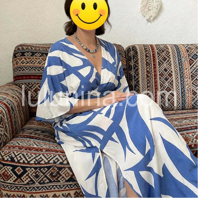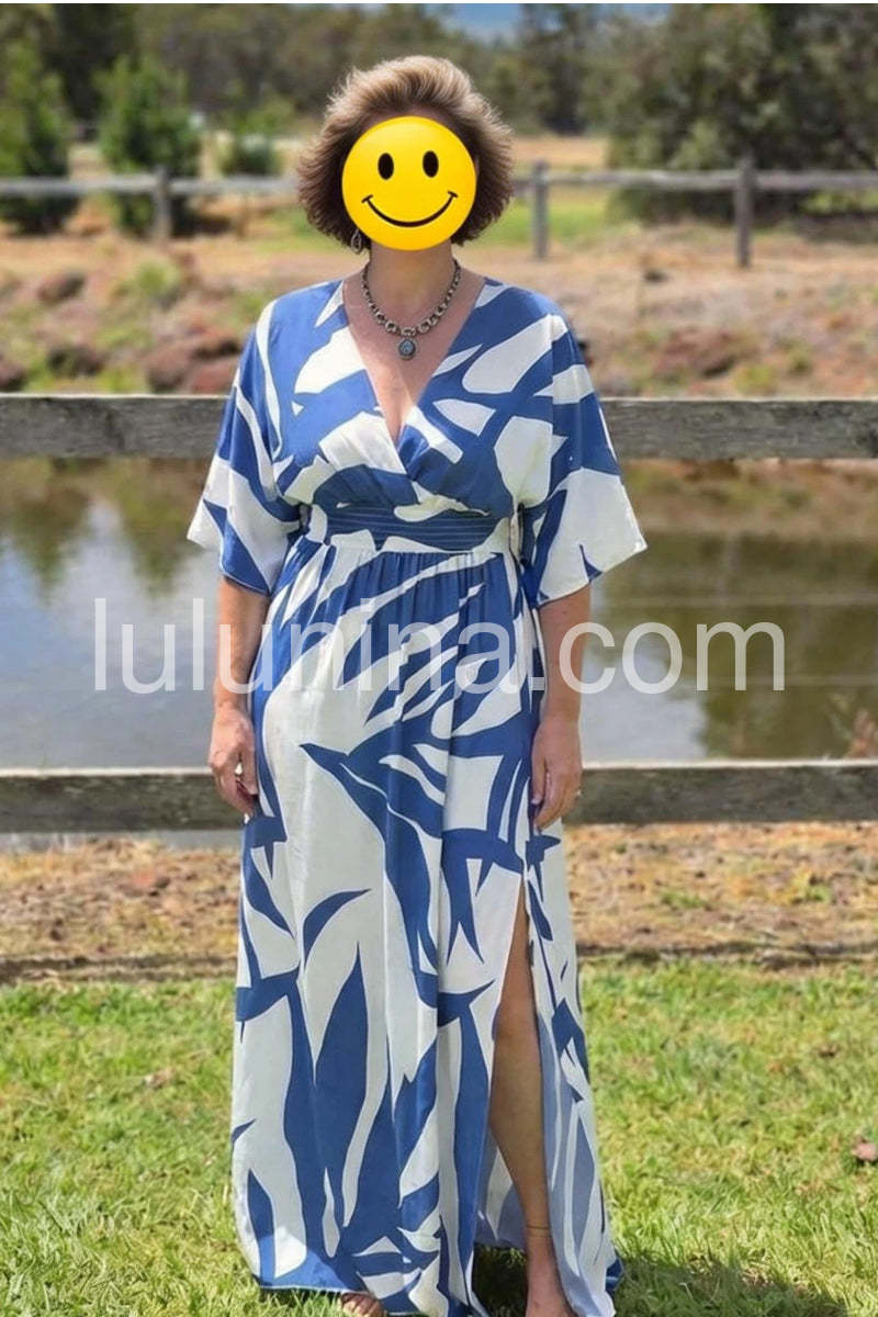 The Blue Print Long Sleeve Maxi Dress brings a beautiful, bold style to any special occasion. The slim-fitting silhouette shows off your shape without sacrificing comfort. The 3/4 sleeves and full skirt create an elegant look that will impress. Crafted from a lightweight fabric, it's the perfect complement to your wardrobe.