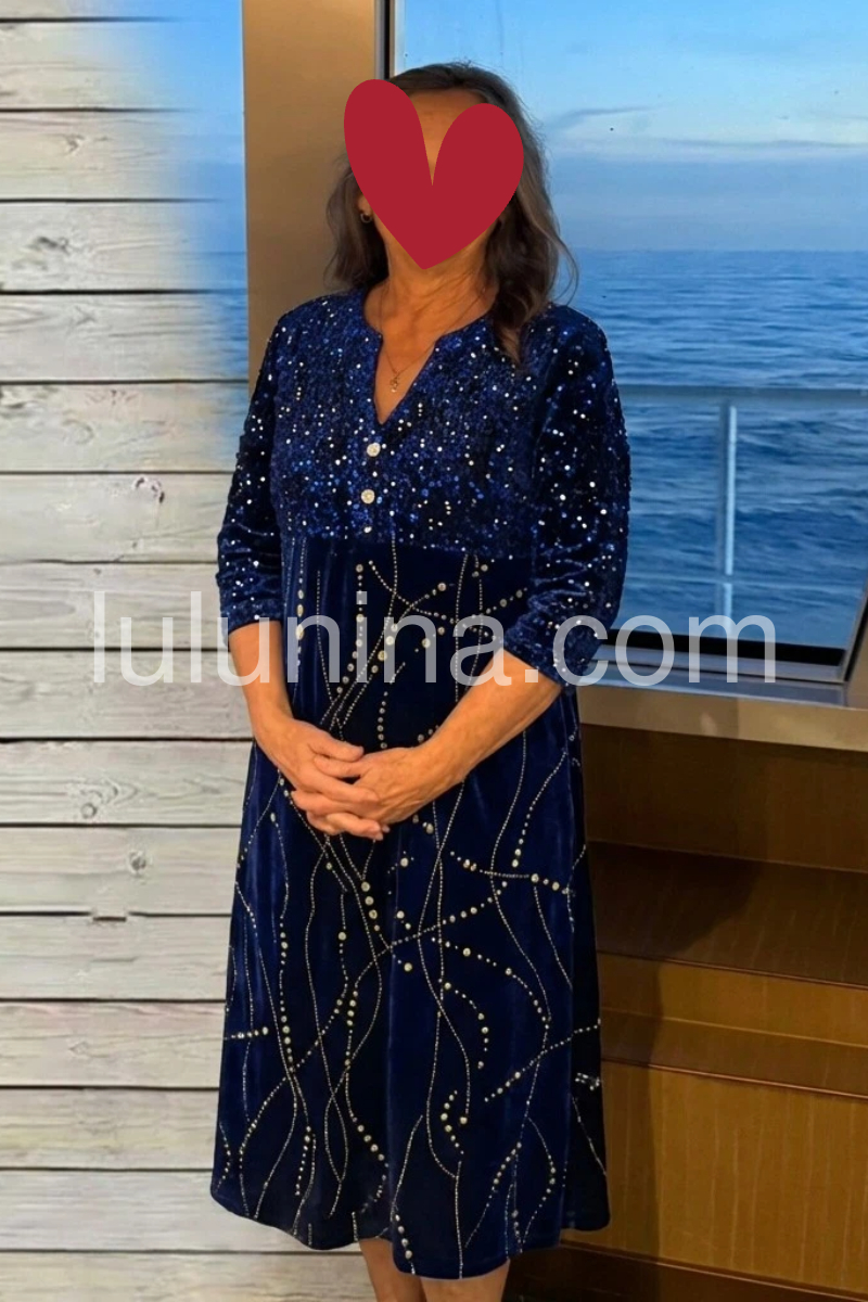 A royal blue and cobalt shade intermingle on this long summer dress covered in white line streaks and dots reminiscent of constellations. A button-front round collar v-neckline, three-quarter length sleeves, and flared midi dress silhouette keep it versatile, finished with side pockets. Pair it with flats, heels, a black or brown leather jacket, and hoops. Machine wash cold tumble dry low to medium heat. Iron if needed or lay flat to dry.