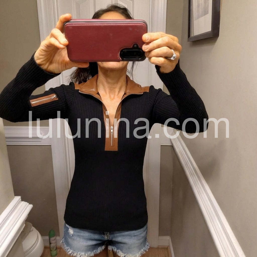 Chic Black Half Zip Long Sleeve Top