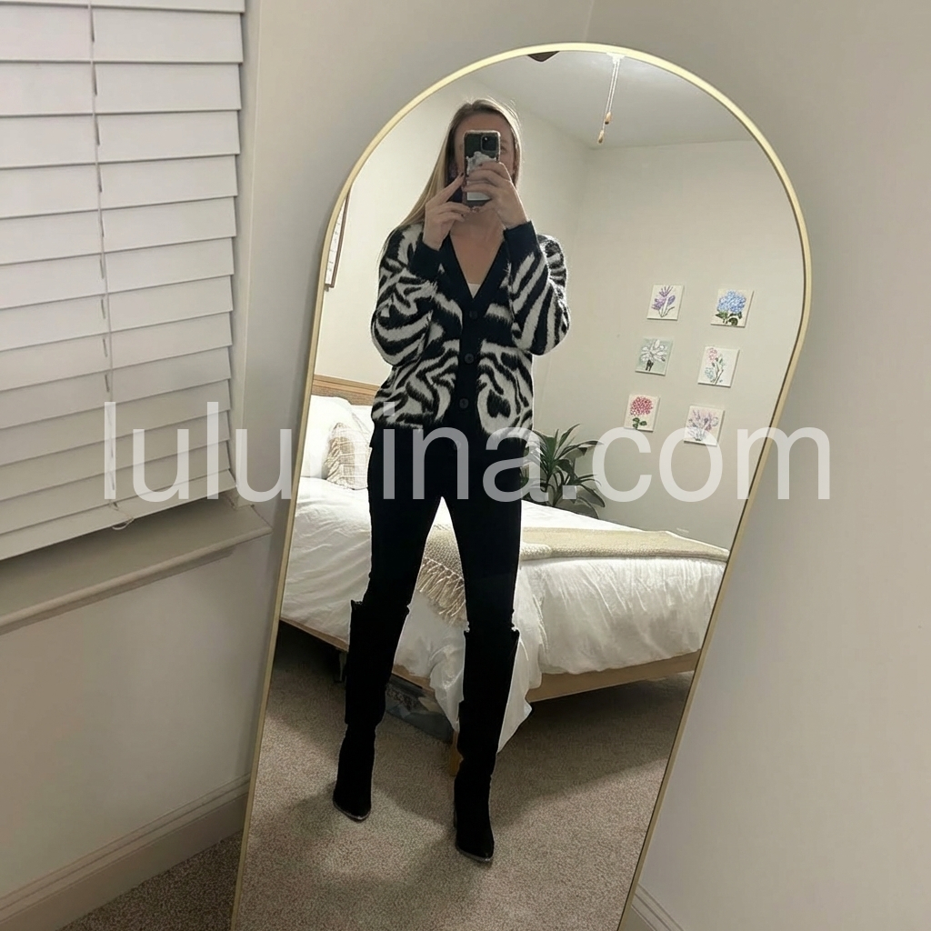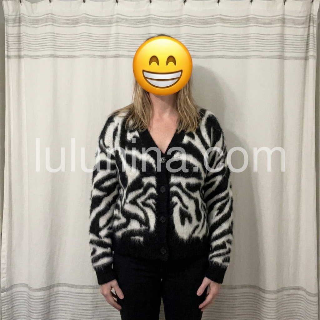 Elevate your wardrobe with this bold zebra-print knit cardigan crafted from a luxurious soft mohair blend. Its distinctive pattern adds a striking visual contrast, while the mohair fibers ensure lightweight warmth and a plush texture. Designed for both style and comfort, this cardigan is ideal for layering during transitional seasons, providing a sophisticated yet edgy statement piece to your collection.