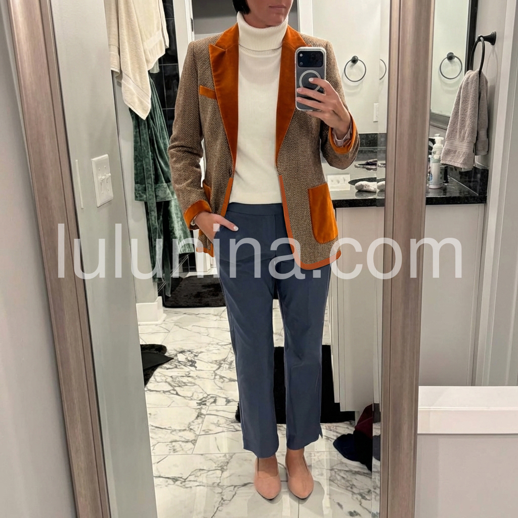 Elevate your wardrobe with this sophisticated brown herringbone velvet blazer, a timeless piece that seamlessly bridges vintage charm and contemporary style. The luxurious velvet fabric showcases a classic herringbone weave, delivering both visual depth and tactile elegance. Featuring a refined single-button closure, this blazer offers a streamlined silhouette that flatters various body types while maintaining impeccable structure. The rich brown tone pairs effortlessly with neutrals or bold accents, making it an indispensable layering piece for professional settings, evening occasions, or elevated casual wear. Perfect for those who appreciate quality craftsmanship and enduring design.